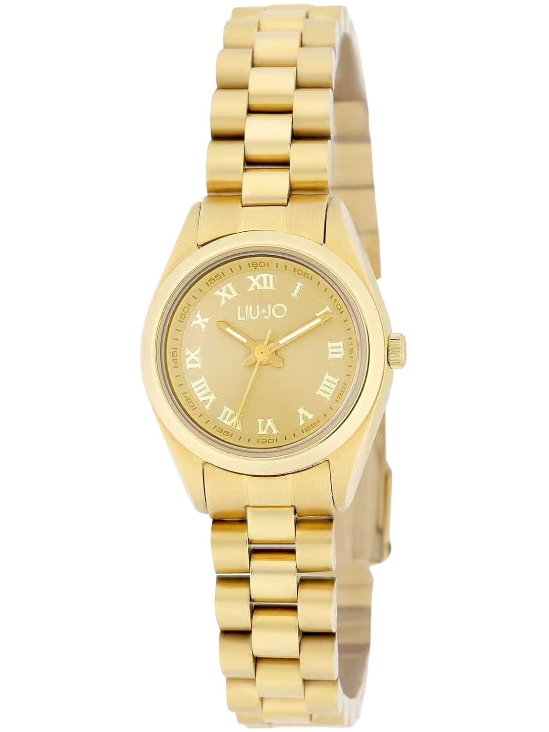 La correa es de color dorado y está hecha de acero.