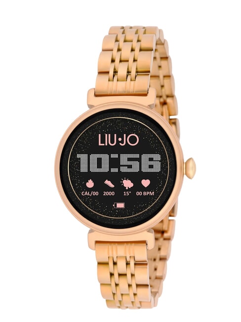 La correa es de acero inoxidable rosa.
