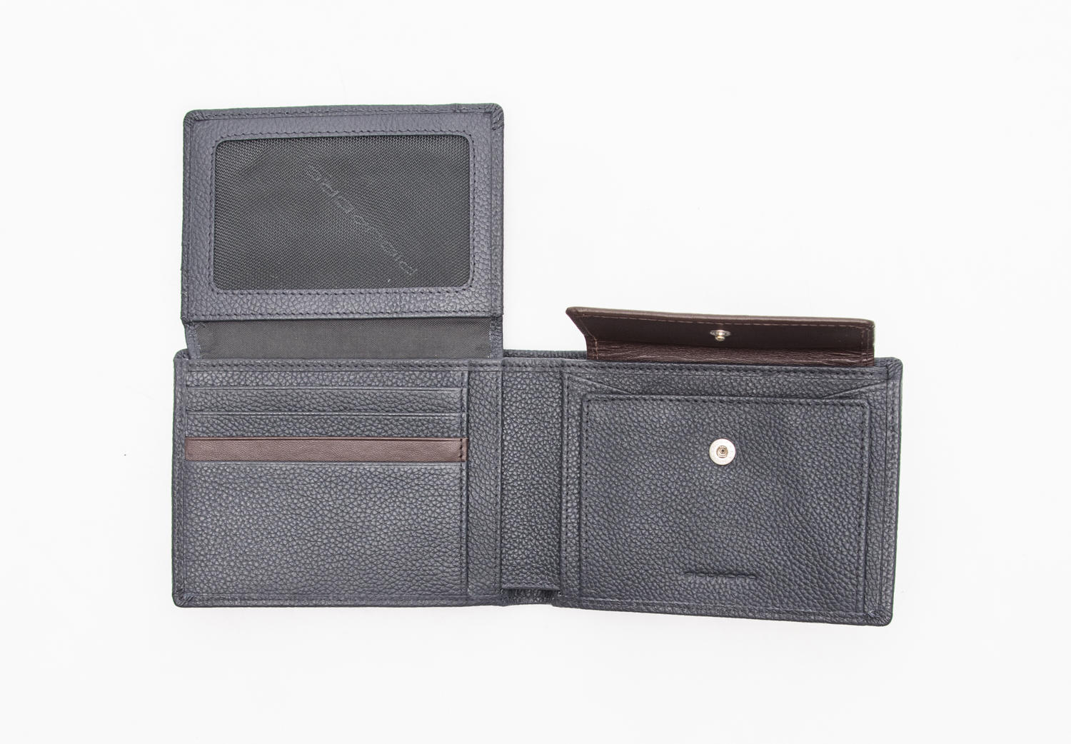 - Solapa con tres ranuras para tarjetas, tres compartimentos para documentos, de los cuales uno de malla