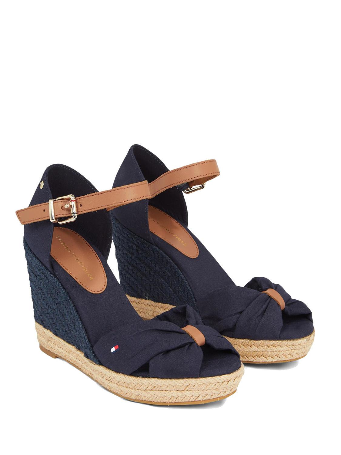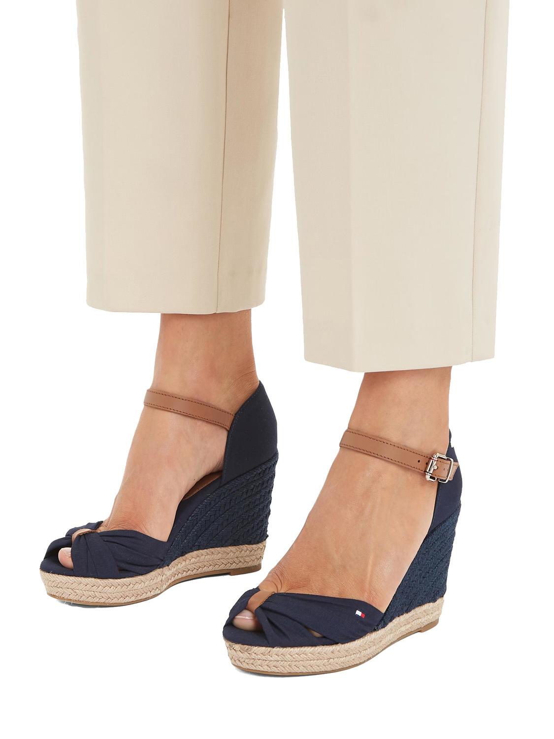 - Sandalias altas de punta abierta en tela con detalles de cuero.